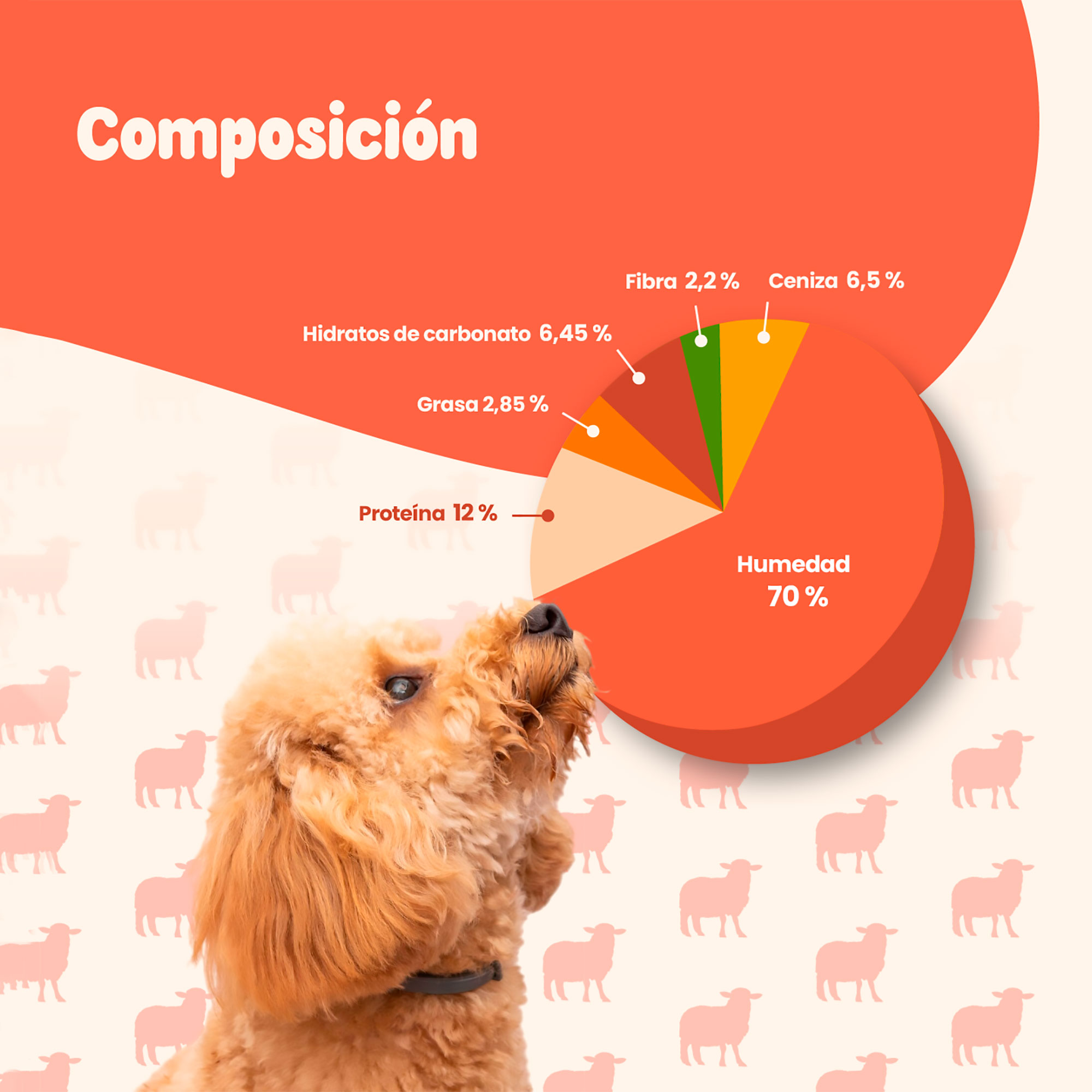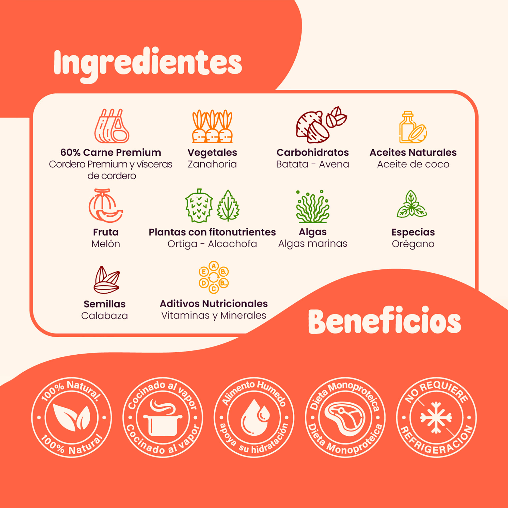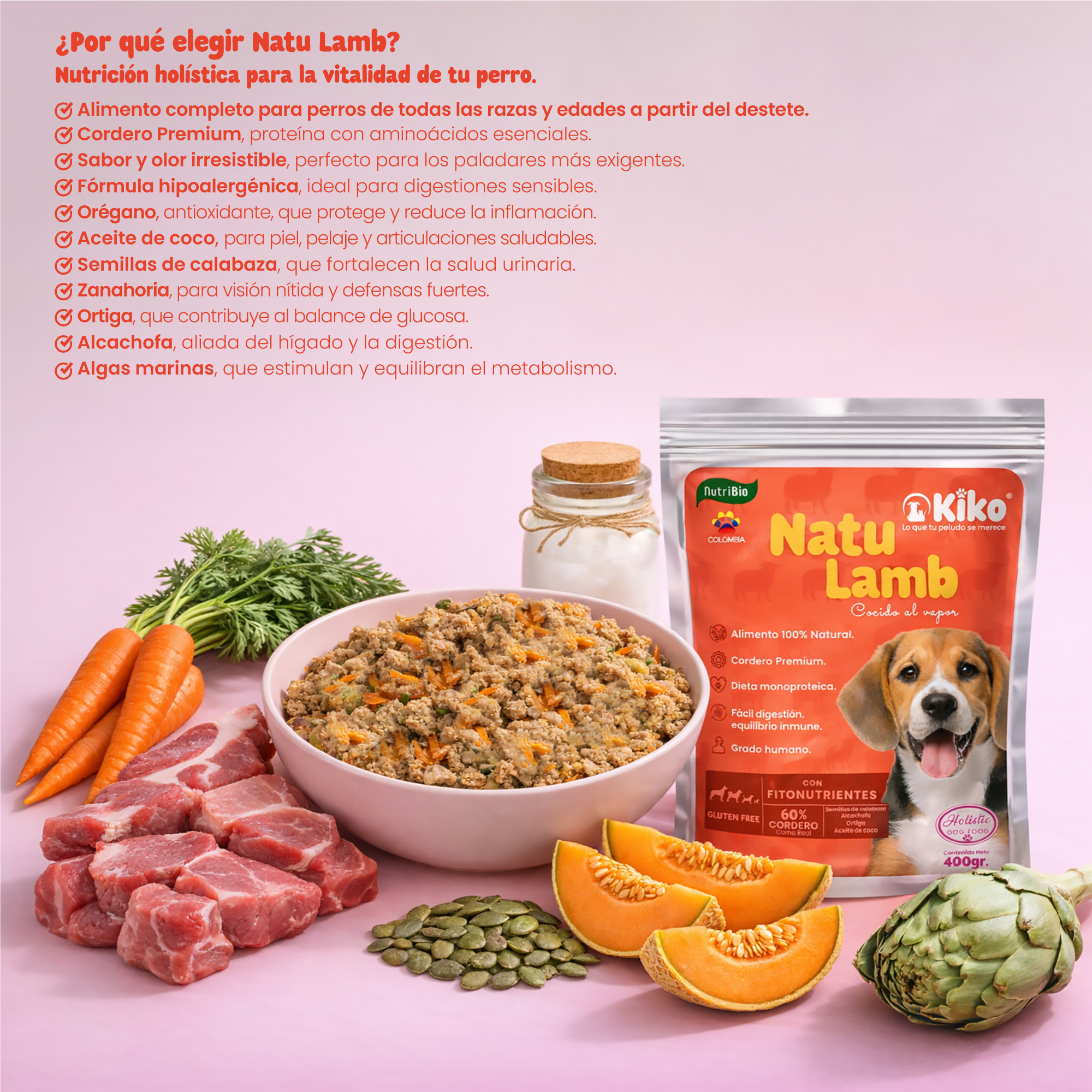 NATU LAMB es un alimento húmedo holístico y natural para perros, elaborado con 60% de carne magra de cordero grado humano como única fuente de proteína animal.