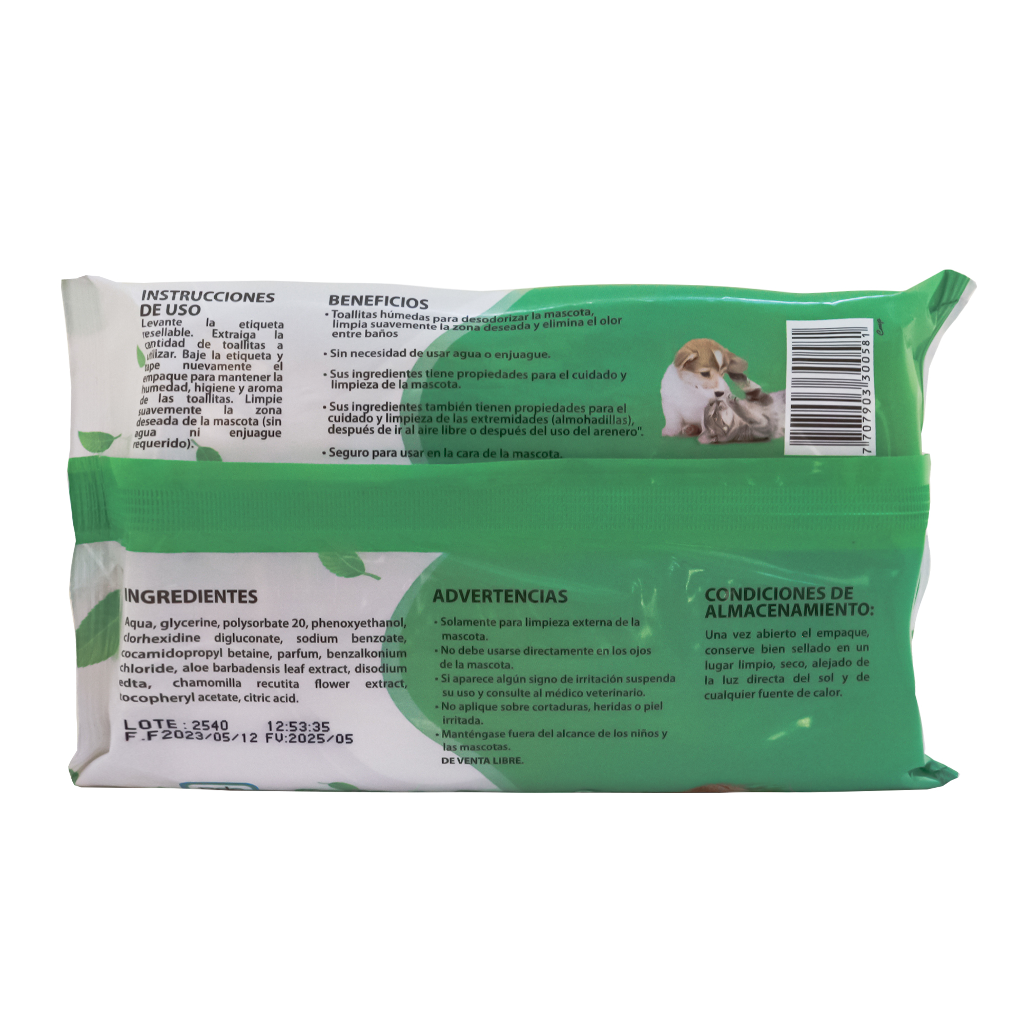 Toallitas húmedas para desodorizar la mascota, limpia suavemente la zona deseada y elimina el olor entre baños.